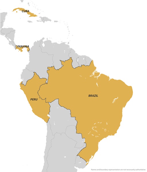 - 以下国家/地区(见地图)报告的 Oropouche 病例数量较少: